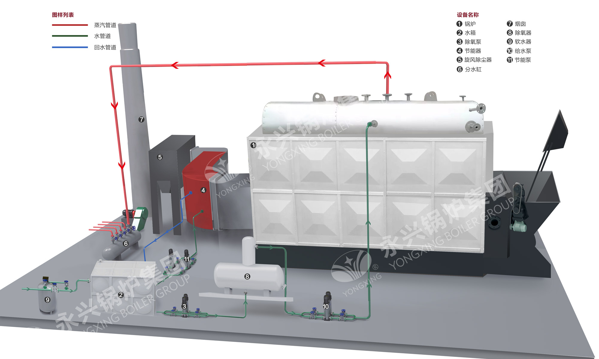 永兴特种设备研发的DZL型生物质锅炉是一种采用生物质颗粒做燃料的单锅筒纵置式链条炉排锅炉,是新一代高效节能的锅炉产品。它采用的燃料生物质是一种理想的可再生能源,每年都有大量的产出,用它代替煤的燃烧,不仅可以为企业降低成本,带来丰厚的经济回报,而且废物利用,增加了农民的收入,实现了经济效益和社会效益的共同发展。不仅如此,此锅炉还具有升压快、热效率高、受热面积大等优势。